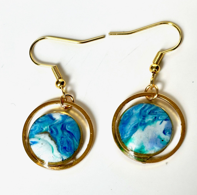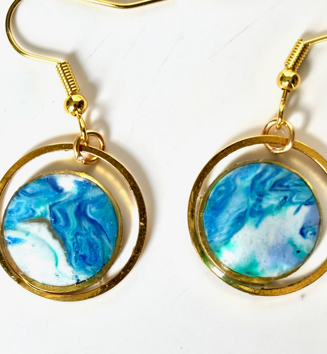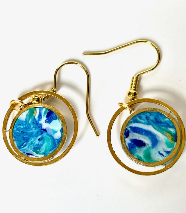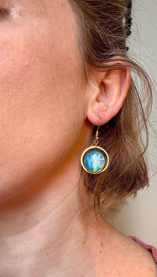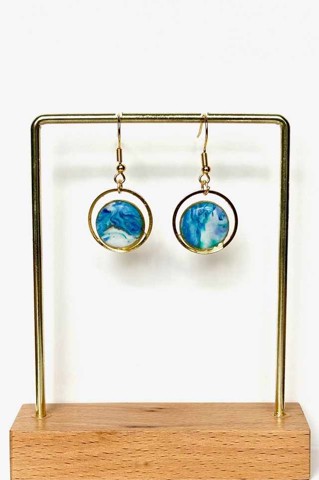 Boucles pendantes composées d’un cabochon rond en argile polymère marbrée bleu et blanc, serti dans cercle doré lui-même porté par un autre cercle doré.