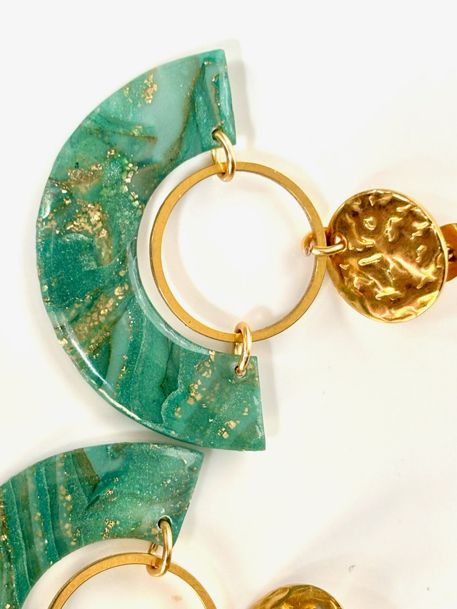 Boucles pendantes dorées composées d’un clou d'oreille en acier doré martelé, d’un anneau doré lisse et d’un demi-cercle enclavé en argile polymère marbrée vert émeraude, parsemé de feuille d'or.