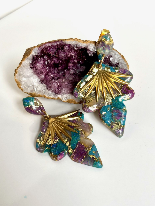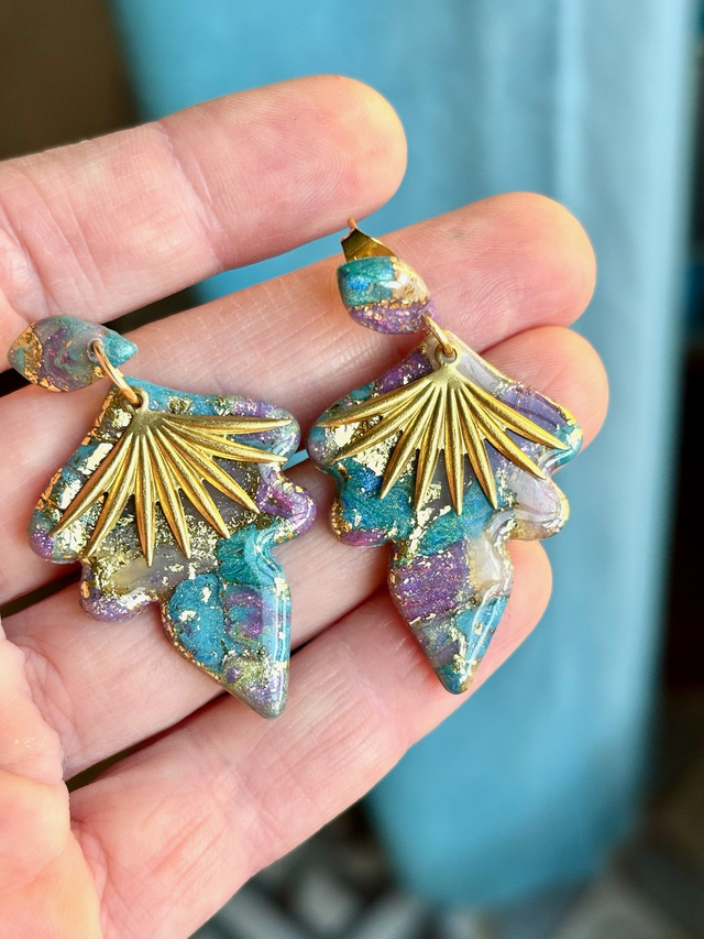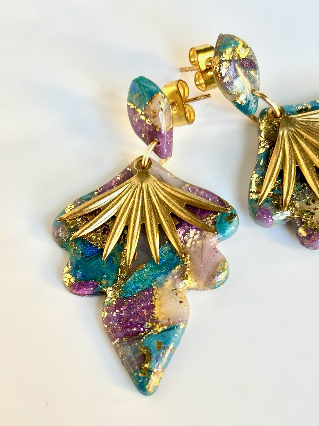 Boucles d'oreilles où chaque pièce se compose d’un pétale et d’un pendant en forme de feuille stylisée, réalisé en polymère marbrée aux nuances de bleu, violet, transparent et or soutenu par une palmette dorée, évoquant le rayonnement solaire.