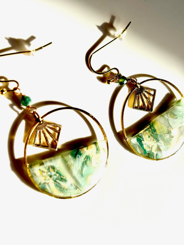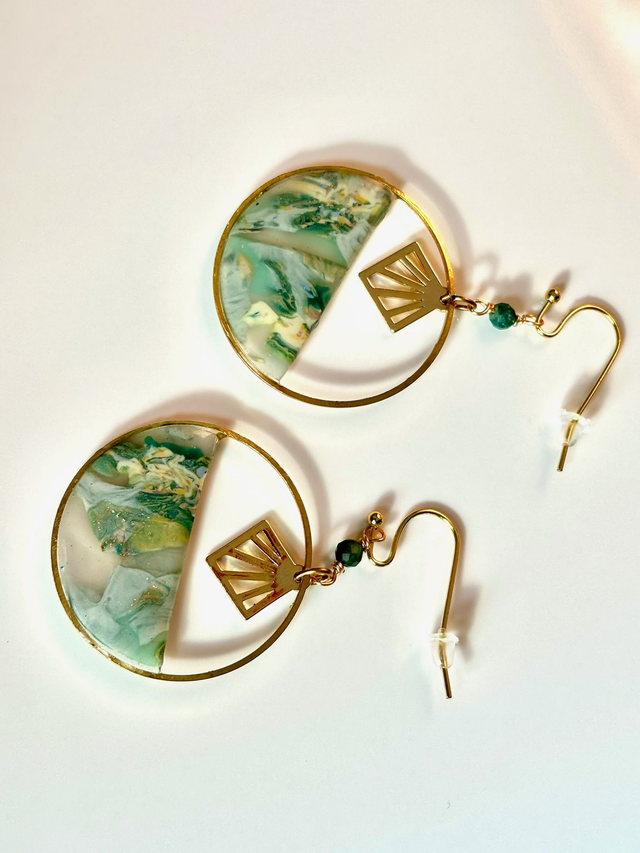 Boucles composées d’un cercle doré en acier inoxydable, orné d’un demi-cercle en argile polymère marbrée aux teintes de vert mousse, jaune soleil et blanc nacré qui se laisse traverser par la lumière.
