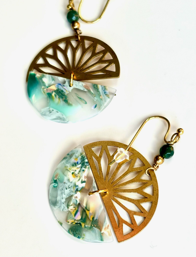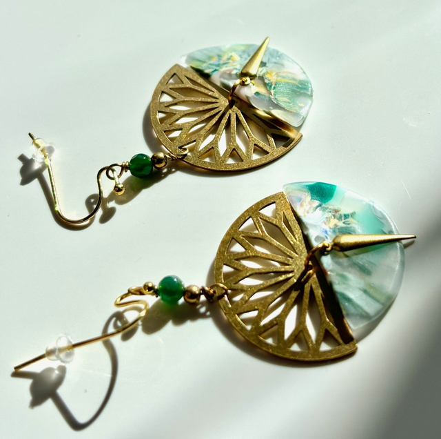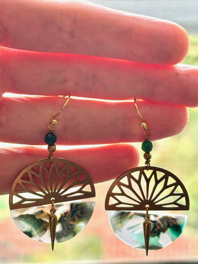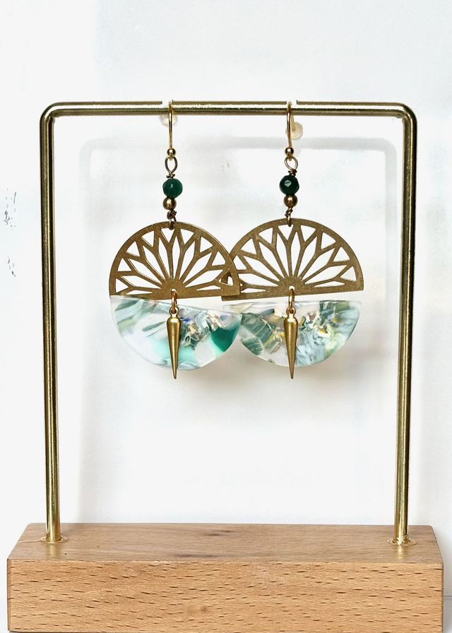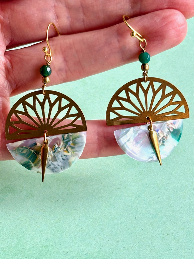 Composées de perles d'agate vertes et acier inoxydable, d’un éventail doré ajouré et d’un demi-cercle d'argile polymère marbrée dans des nuances de vert translucide ; elles se terminent par une breloque en pointe dorée.
