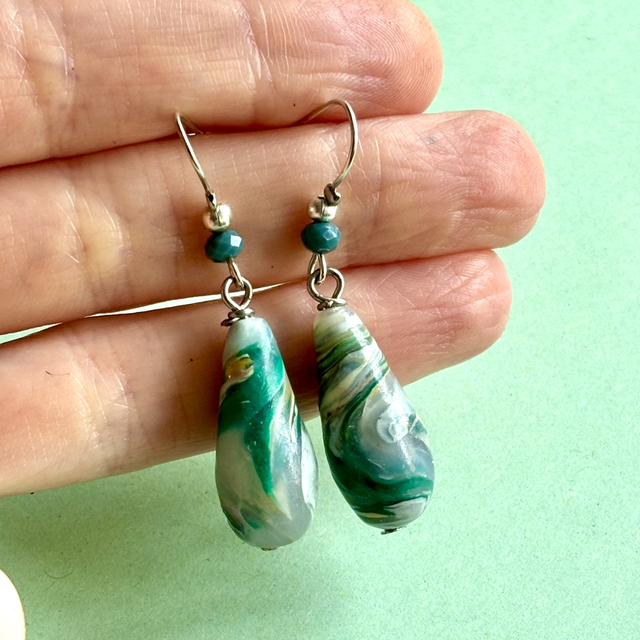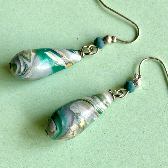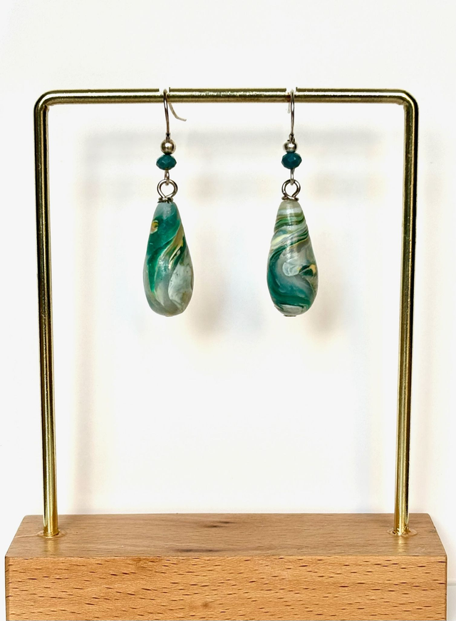 Boucles pendantes en forme de goutte, façonnées en polymère marbrée aux nuances de vert mousse, blanc translucide et jaune doux.