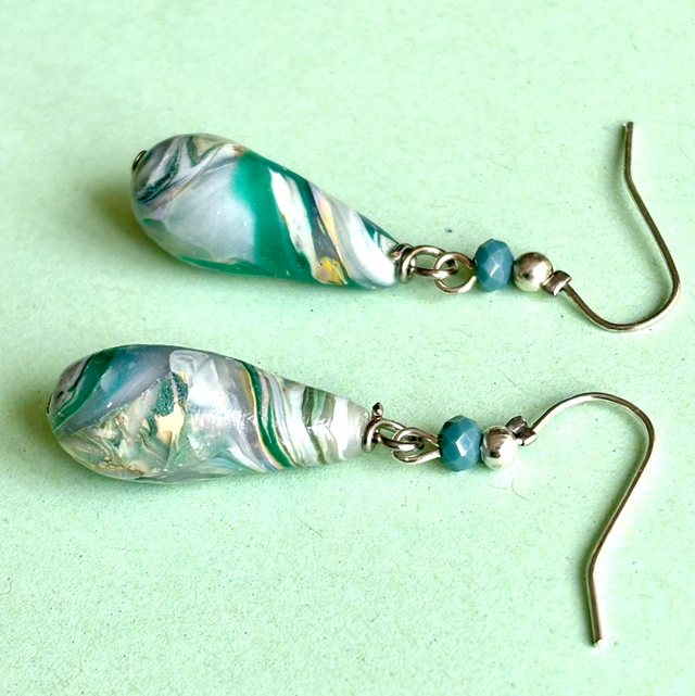 Pièce unique. Boucles d'oreilles gouttes en polymère marbrée et métal argenté.