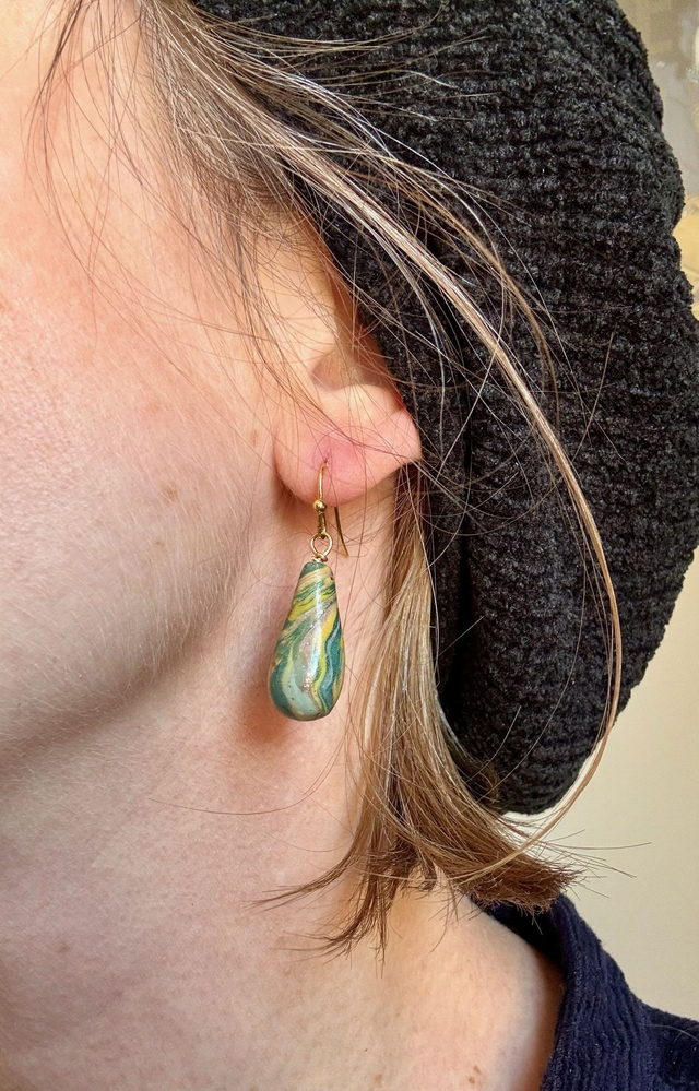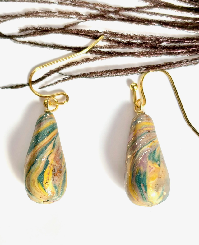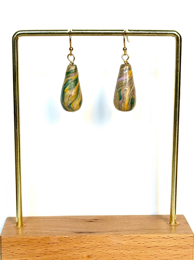 Boucles pendantes dorées composées d’un crochet fin et d’un pendentif en forme de goutte, marbré aux nuances de vert, jaune, violet et or.
