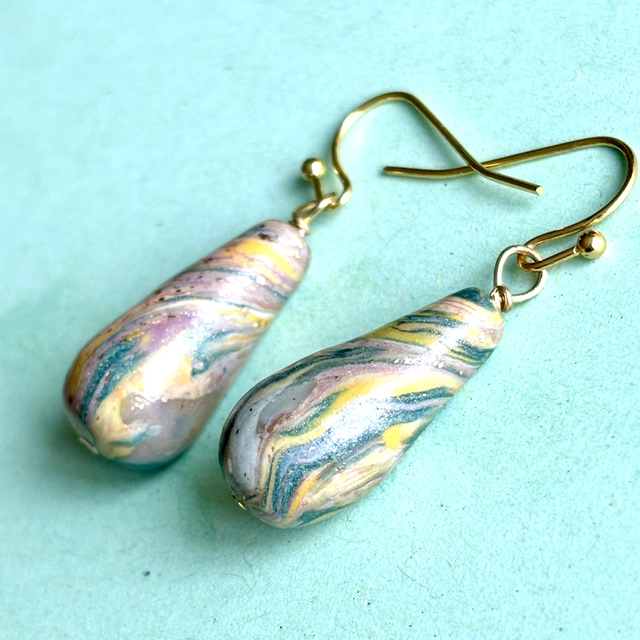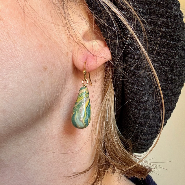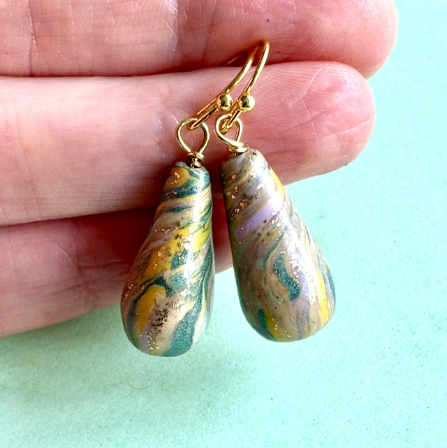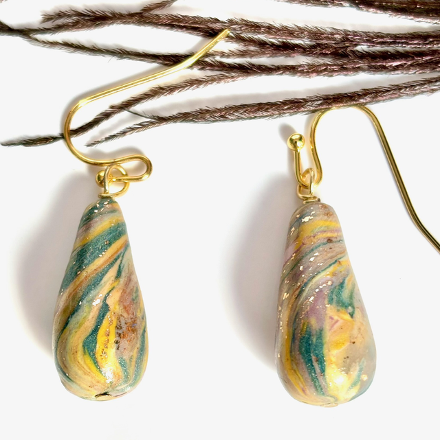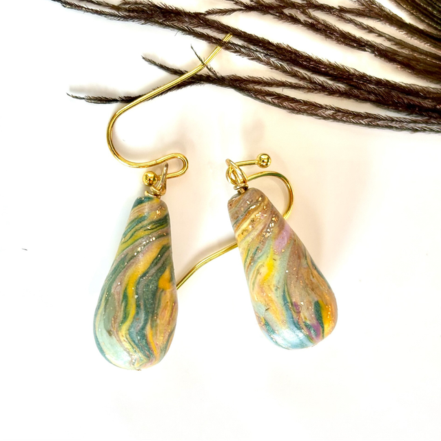 Boucles pendantes dorées composées d’un crochet fin et d’un pendentif en forme de goutte, marbré aux nuances de vert, jaune, violet et or.