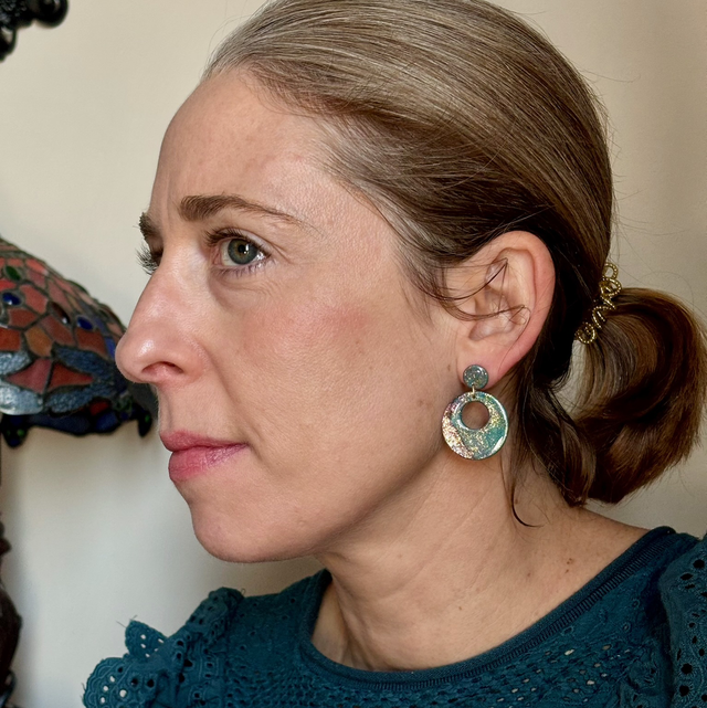 Boucles d'oreilles au design épuré composées d'un cercle de polymère résinée évidé soutenu par un cabochon de polymère résinée.