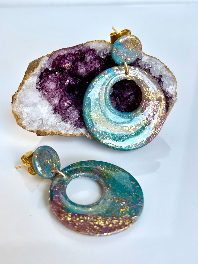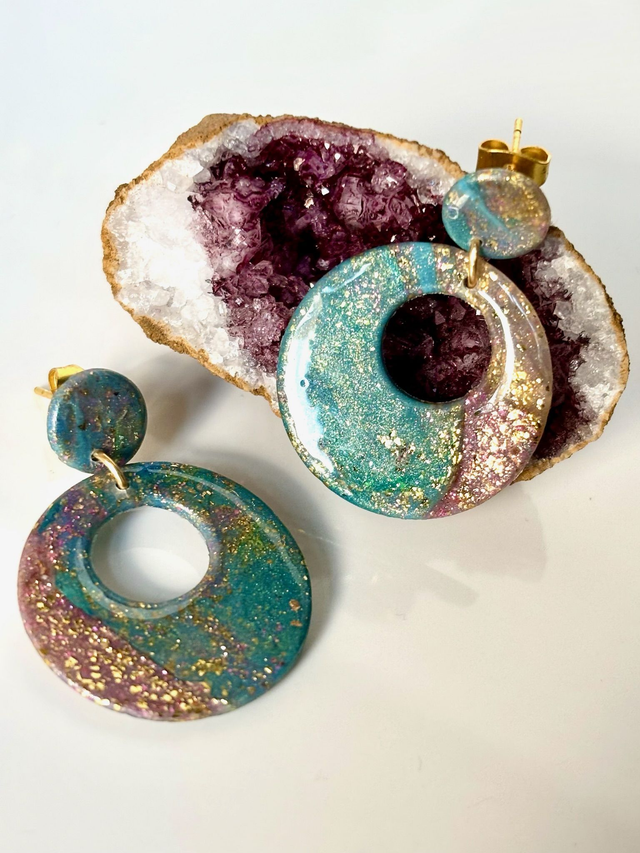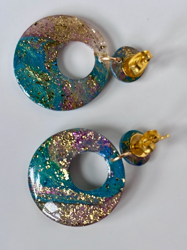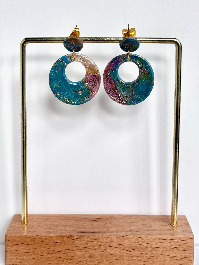 Pièce unique. Boucles d'oreilles en polymère résinée et acier inoxydable.