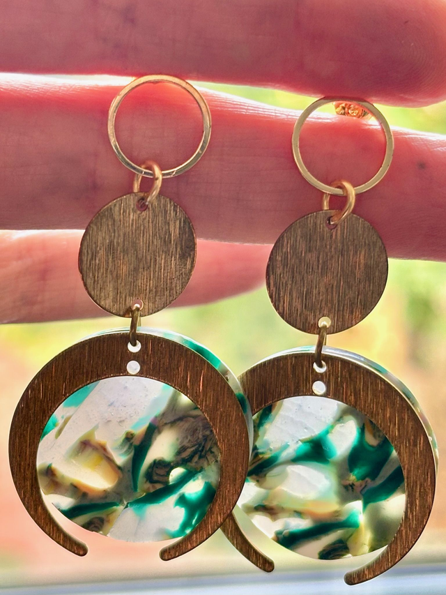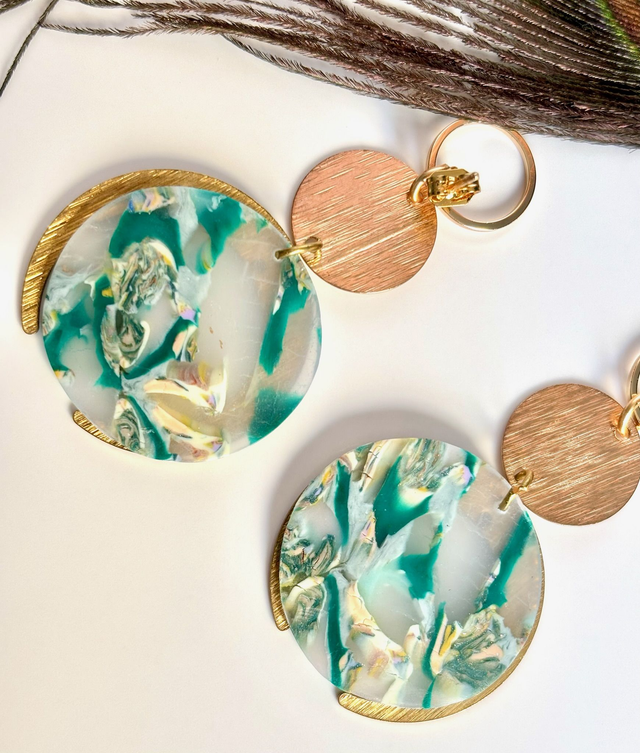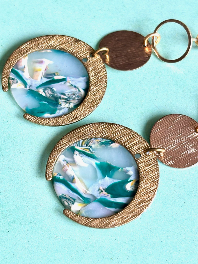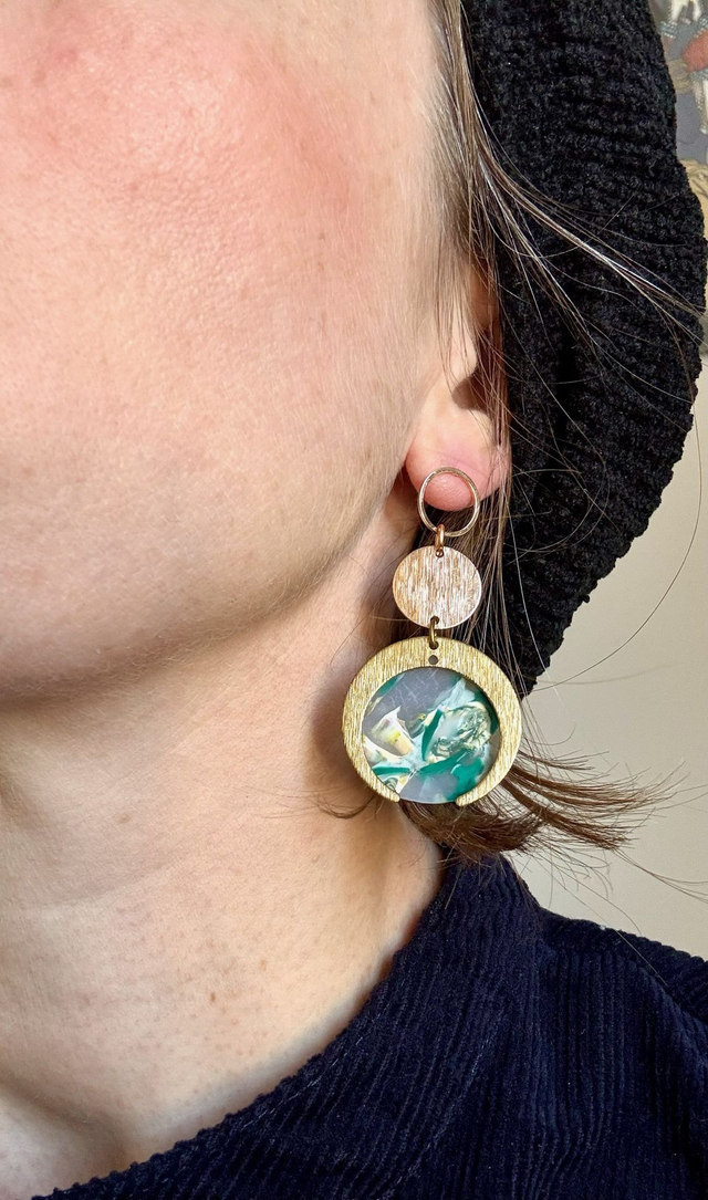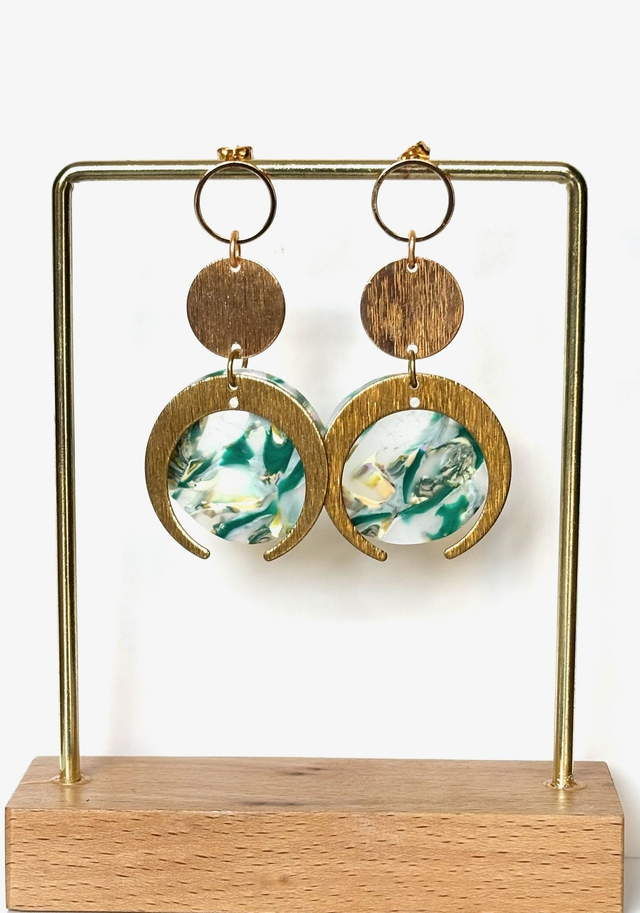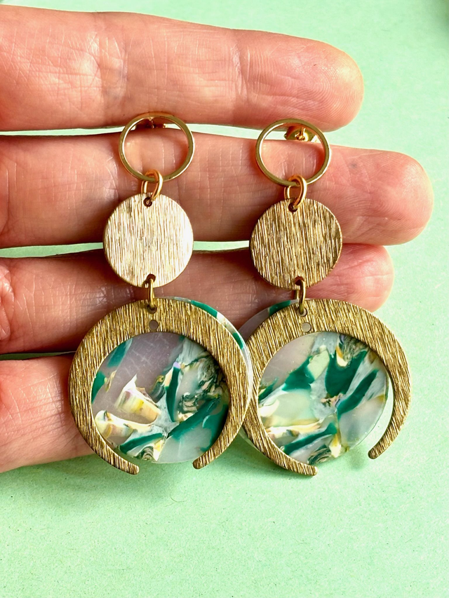 Chaque boucle se compose d’un anneau doré, d’un disque strié et d’un croissant doré accueillant une médaillon marbré de polymère polie aux nuances de vert, blanc et jaune transparents.