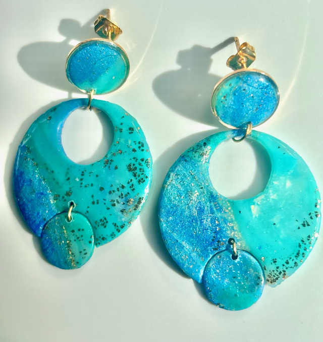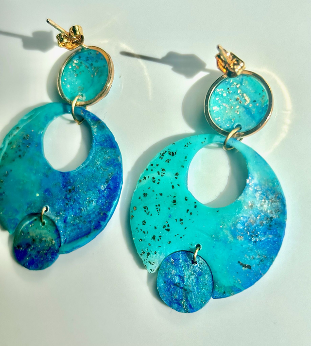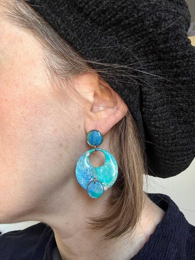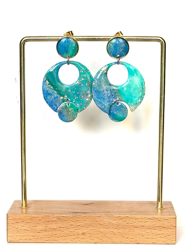 Boucles d'oreilles graphiques en trois cercles superposés, sculptées en polymère marbrée dans les tons turquoises, parsemées de fines paillettes dorées.