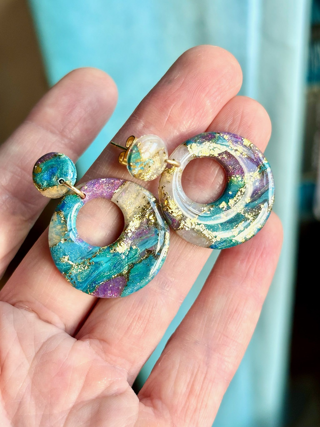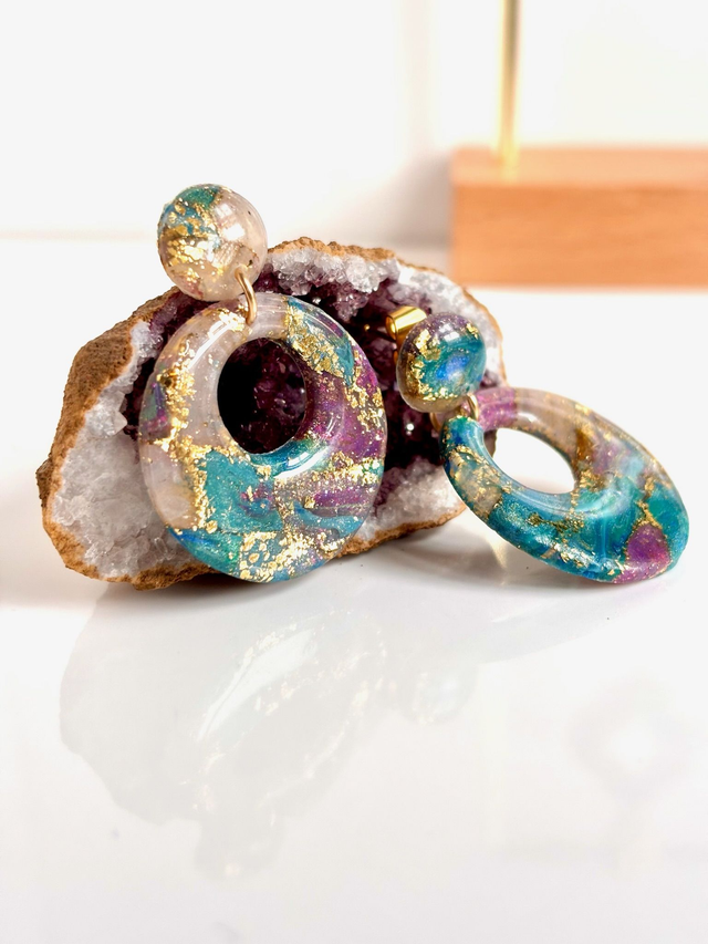 Boucles composées de cercles évidés en polymère résinée suspendues à un cabochon de polymère résinée, ornées d’un clou d'acier doré.