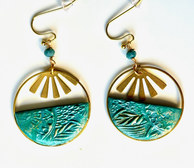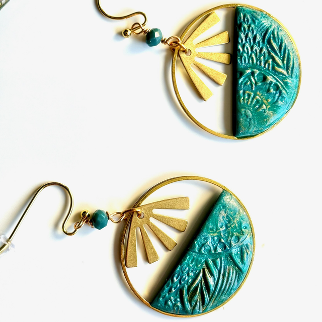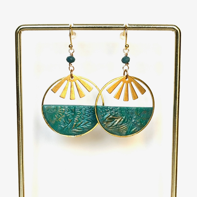 Leur cercle ajouré évoque un soleil stylisé, sublimé par un demi cercle de polymère texturée vert émeraude aux motifs floraux délicats.