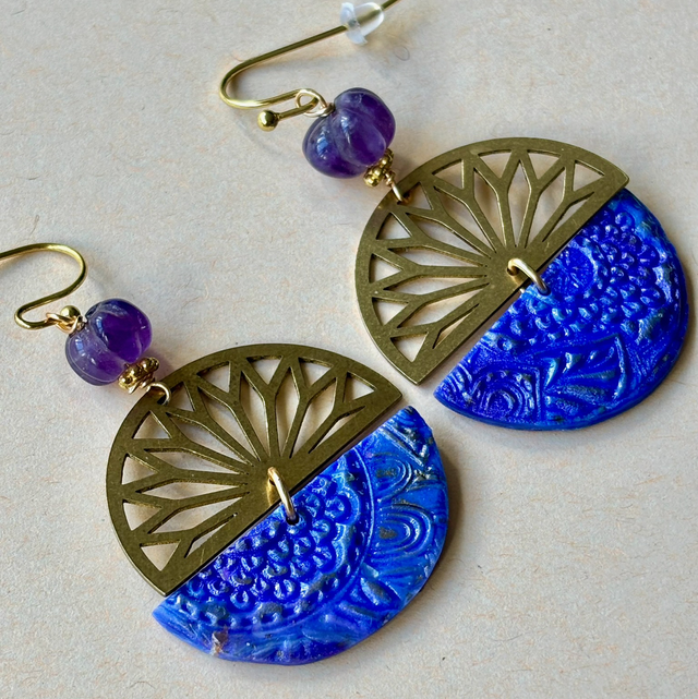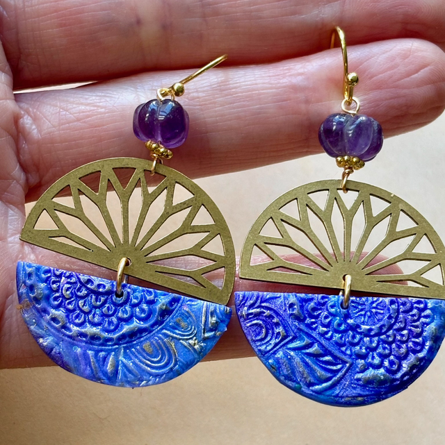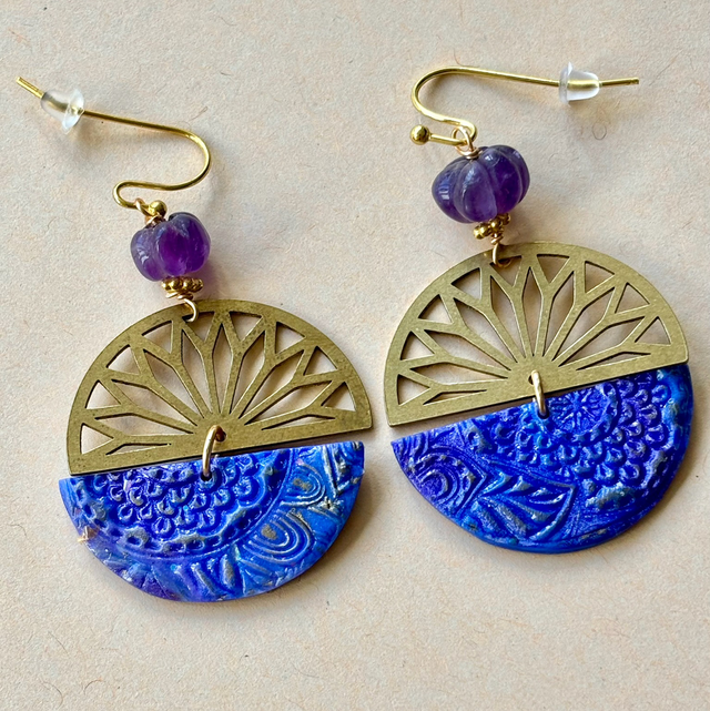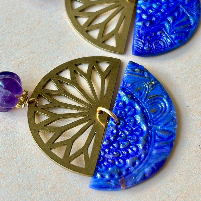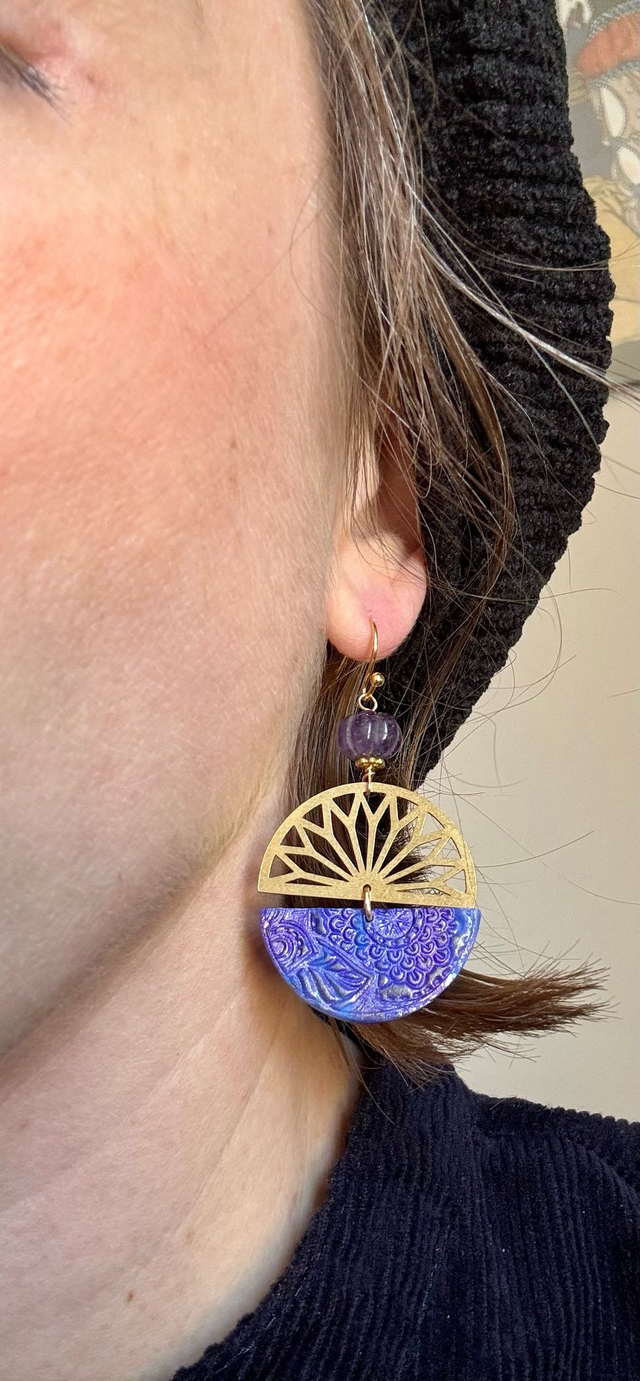 Boucles pendantes rondes au design artistique et contrasté. Chaque pièce est composée d'une pièce de laiton ajouré en éventail, évoquant une rosace stylisée et d'une pièce de polymère aux nuances de bleu et violet, avec des impressions d'or florales délicates, créant un effet de nuit étoilée ou ciel mystique. Une pièce artisanale qui allie éclat, texture et poésie.