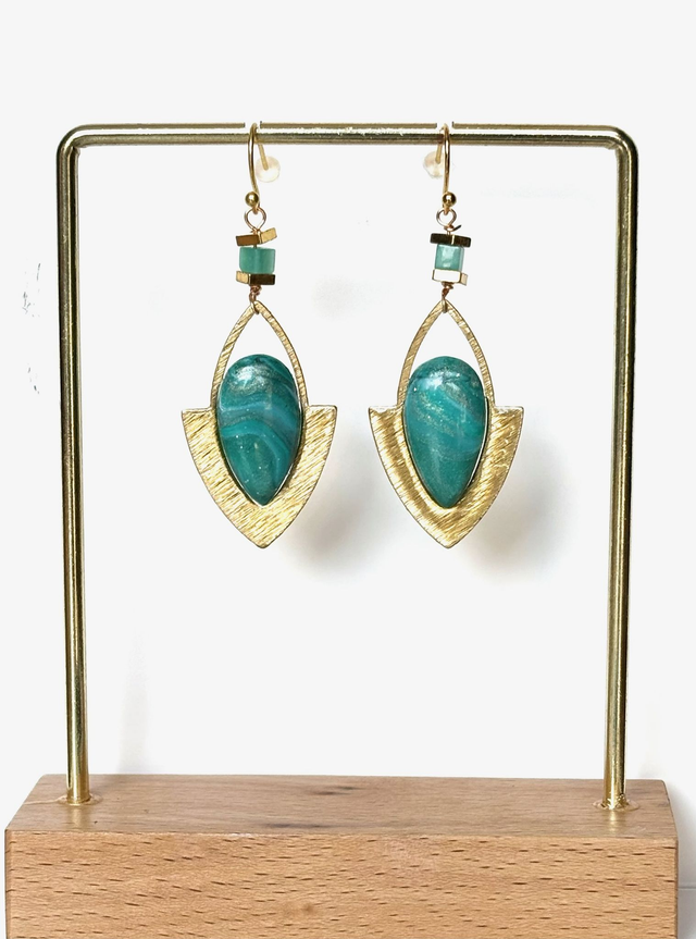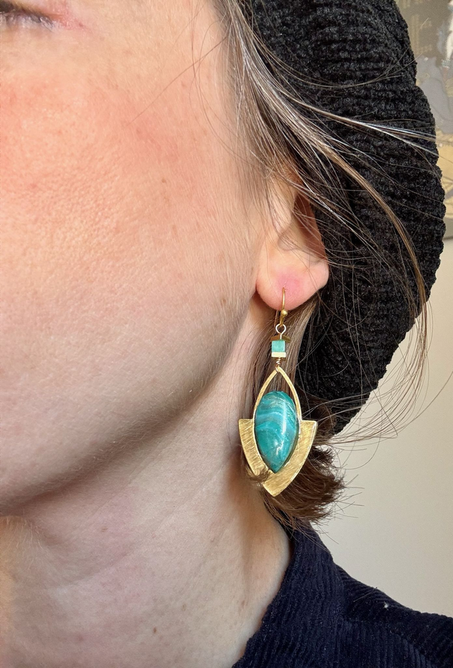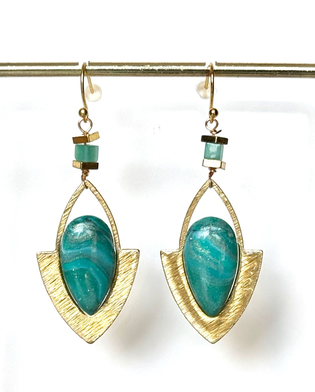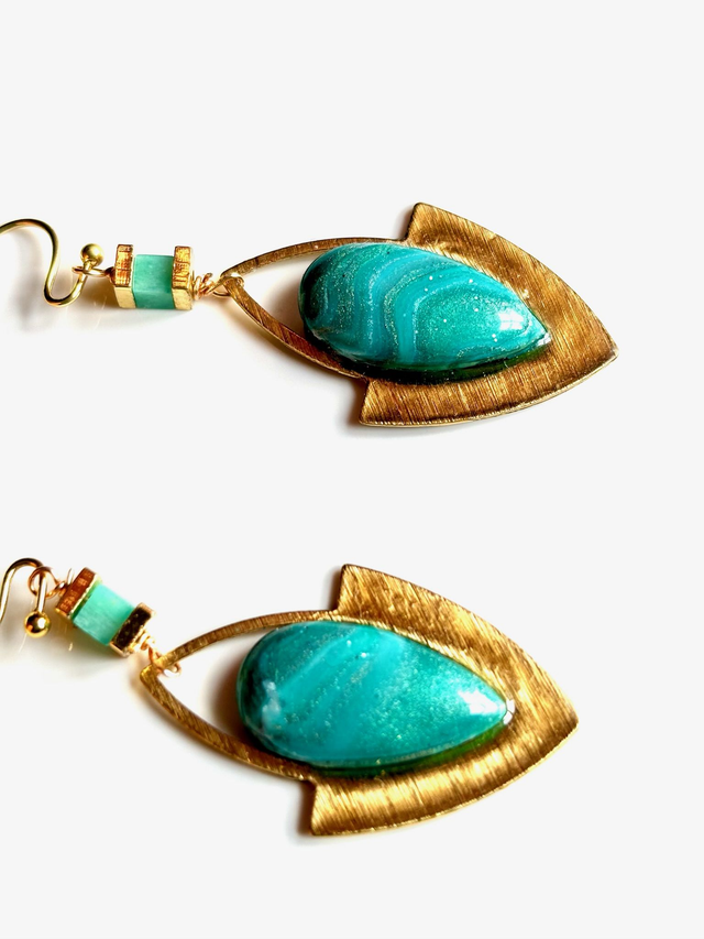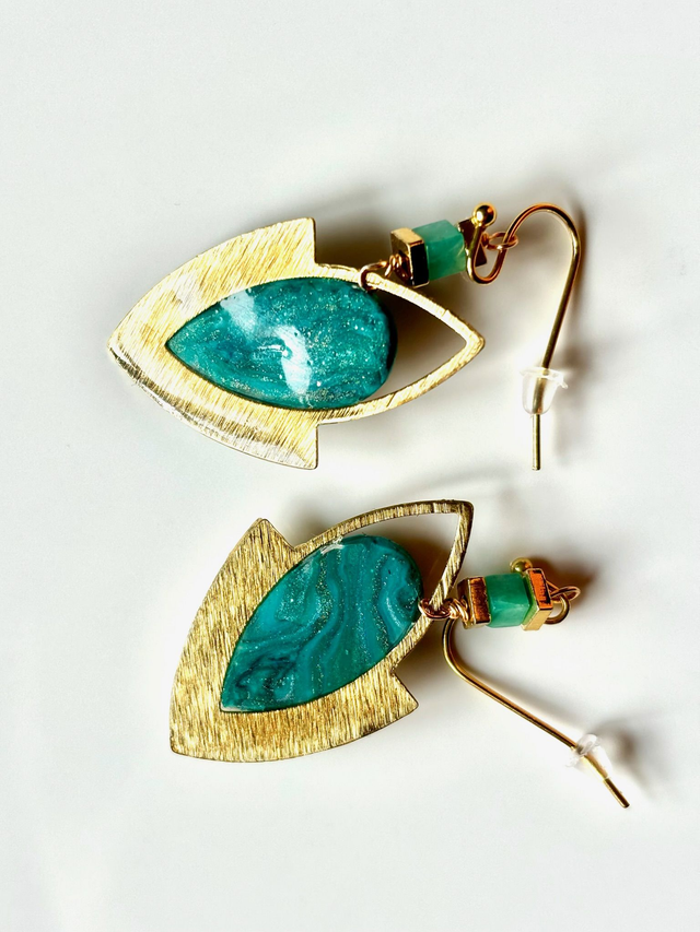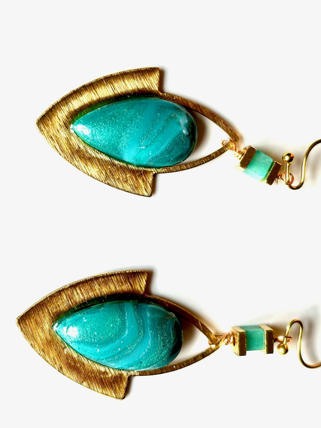 Pièce unique. Boucles d'oreilles talisman en Amazonite, polymère résinée, acier inoxydable et laiton strié.