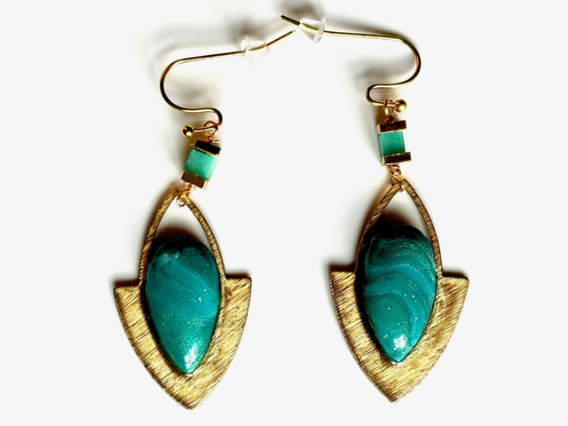 Matériaux : argile polymère, résine UV, laiton strié, acier inoxydable doré, hématite doré, perles cubes d'Amazonite