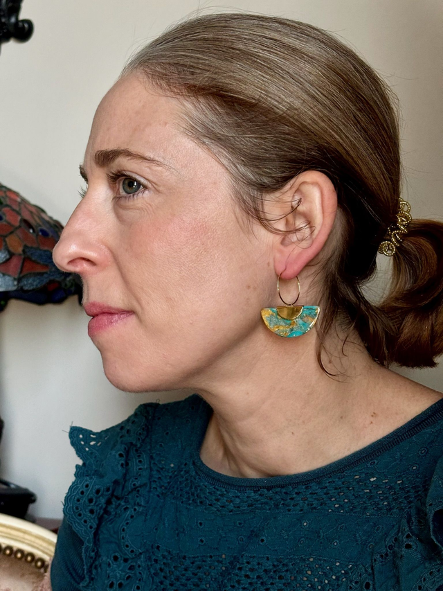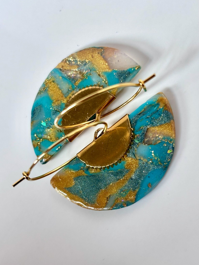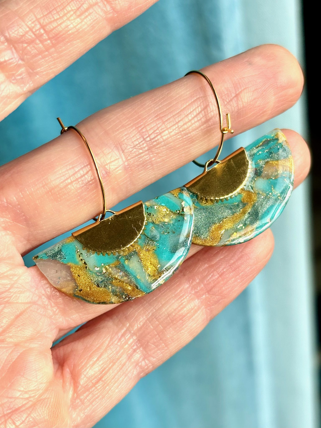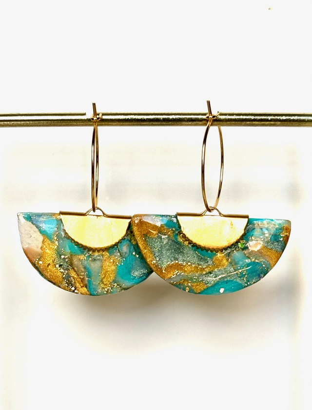 Créoles au design graphique et aquatique. Chaque pièce se compose d’un anneau fin et d’un pendant en demi-cercle, réalisé en polymère marbrée et résinée aux nuances de turquoise et or, pour un effet structuré.