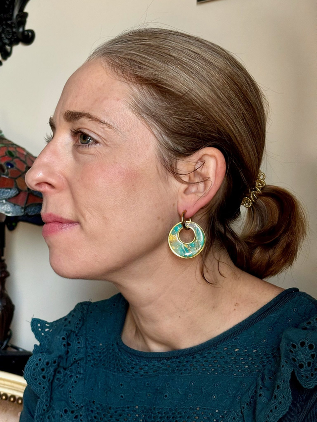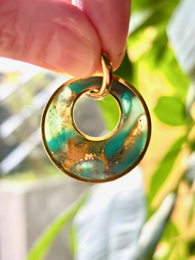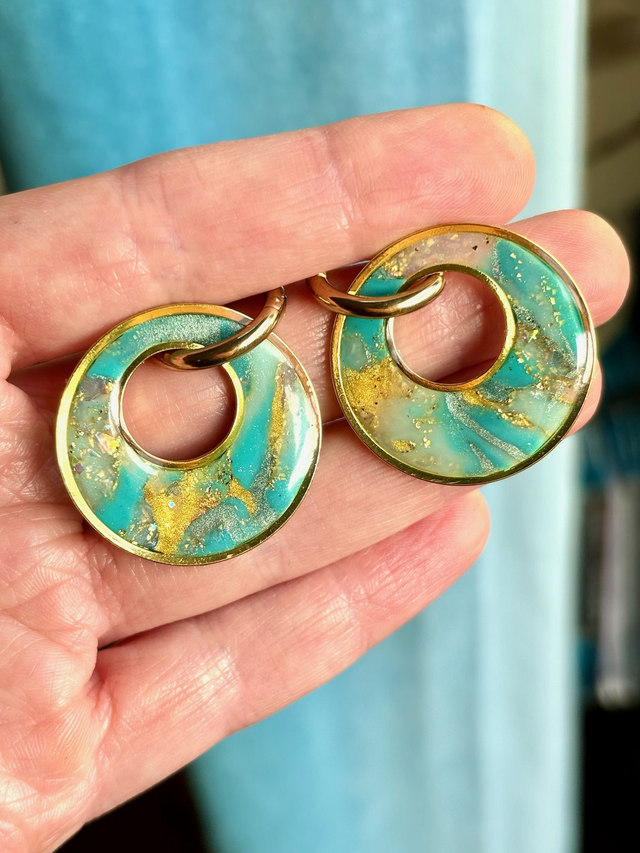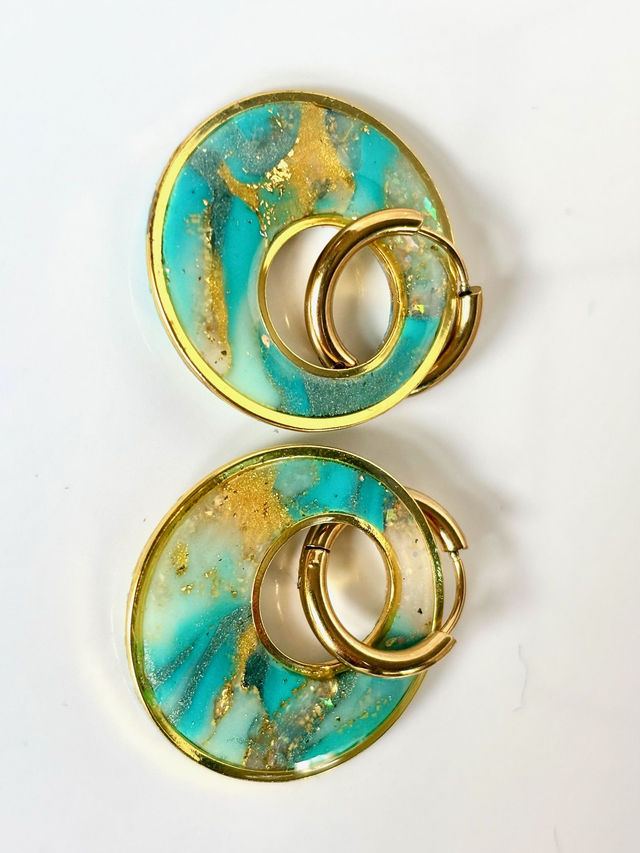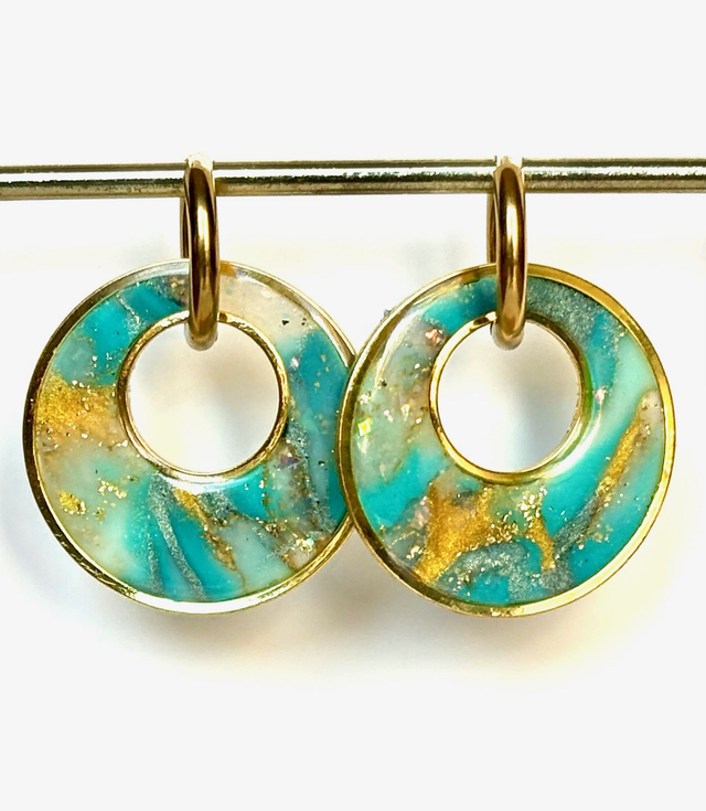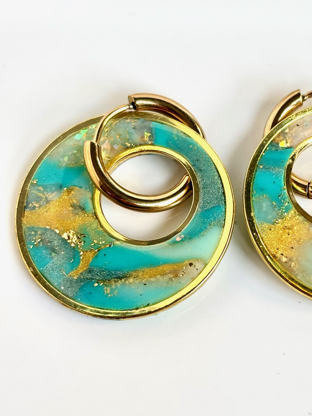Créoles au design circulaire et aquatique. Chaque pièce se compose de deux cercles d'acier doré qui apporte structure et éclat avec un insert de polymère marbrée et résinée aux nuances de turquoise, bleu lagon et or, avec un effet pailleté et nacré.