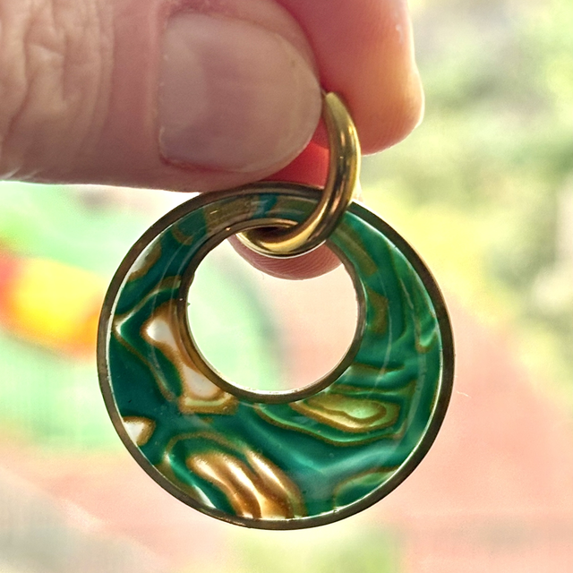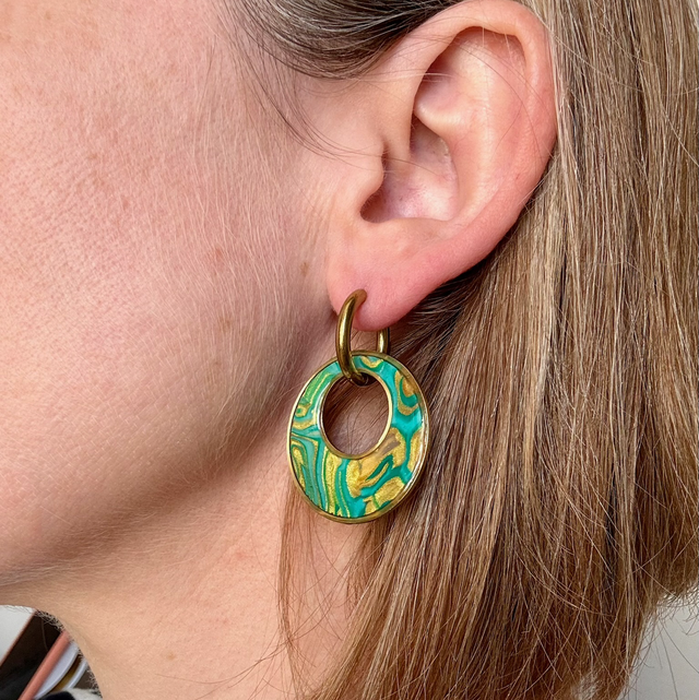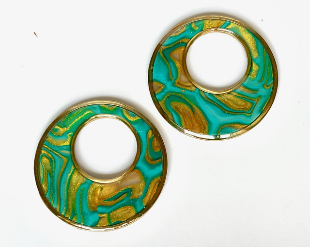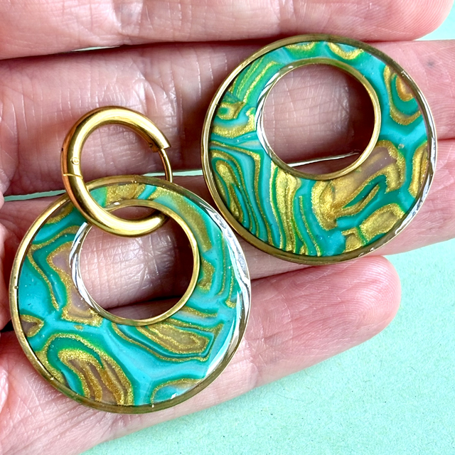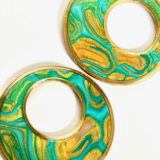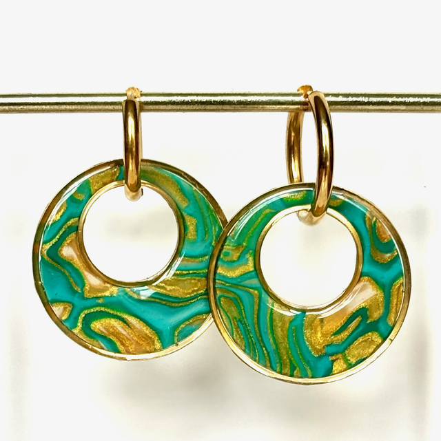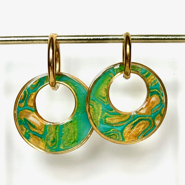 Boucles d'oreilles type créoles composées de deux cercles d'acier inoxydable doré, chacun orné d’un insert en polymère marbrée résinée aux couleurs verts et or, rappelant la peau d'un mamba vert au milieu de la jungle.