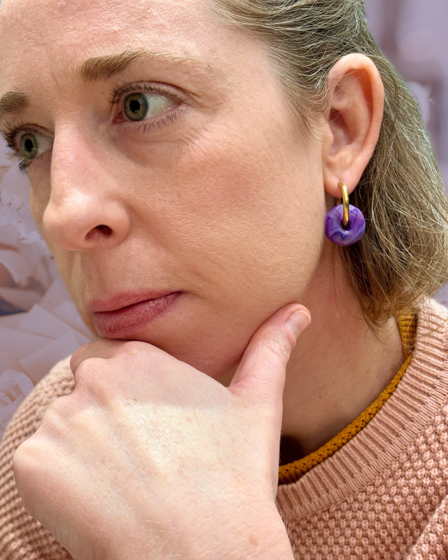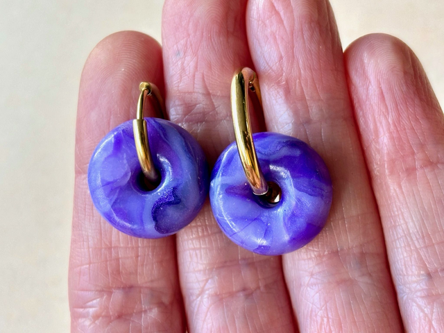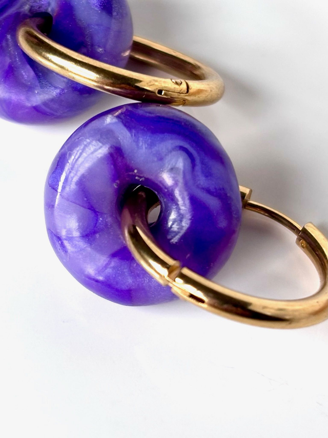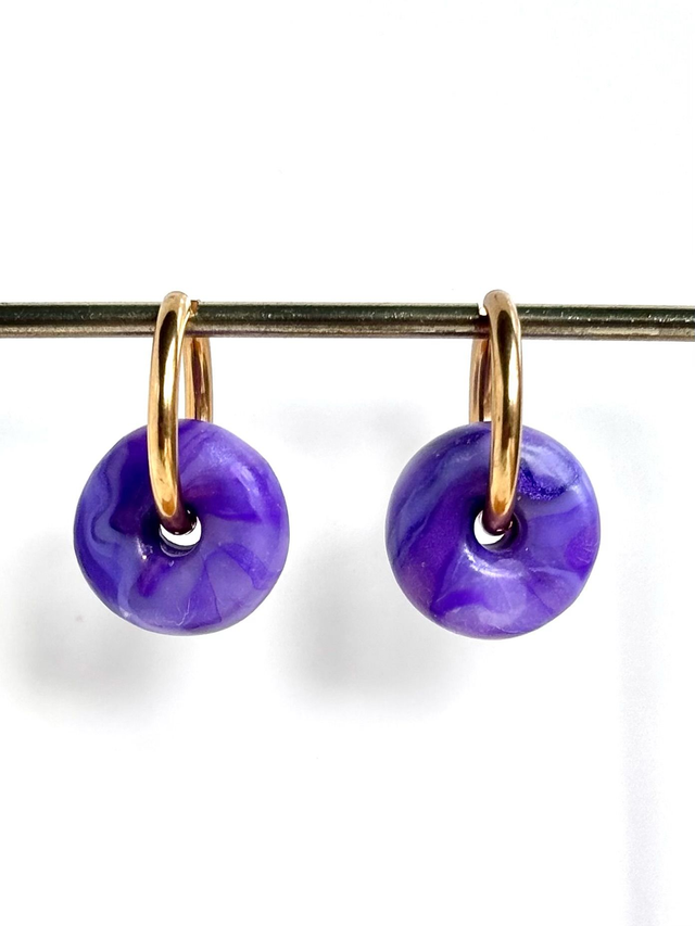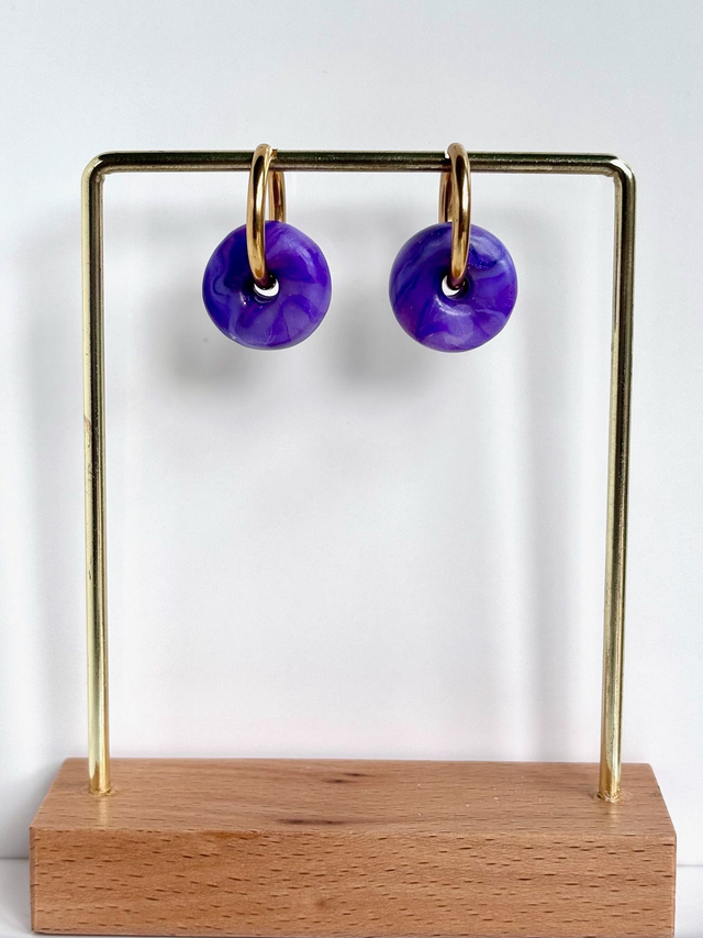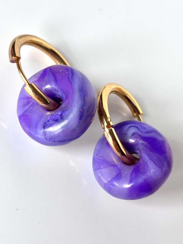 Créoles au design épuré et coloré. Chaque pièce se compose d'une créole en acier inoxydable et d'une perle en polymère polie aux nuances de violet et lilas évoquant une améthyste ou un halo céleste.