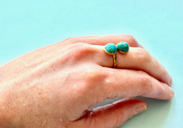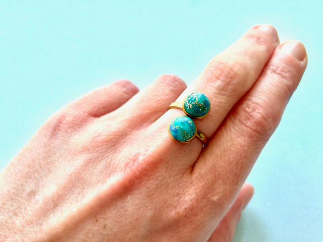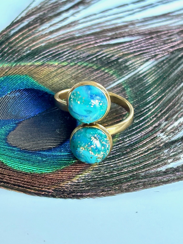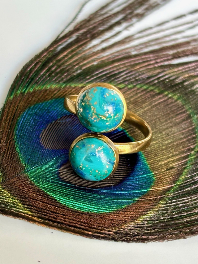Bague dorée réglable ornée de deux cabochons ronds en résine marbrée bleu-vert, parsemés de fines paillettes dorées. Les nuances évoquent les reflets d’un sous-bois humide ou les couleurs vibrantes d’une plume de paon. Chaque pierre est façonnée à la main, ce qui rend chaque motif unique et vivant.