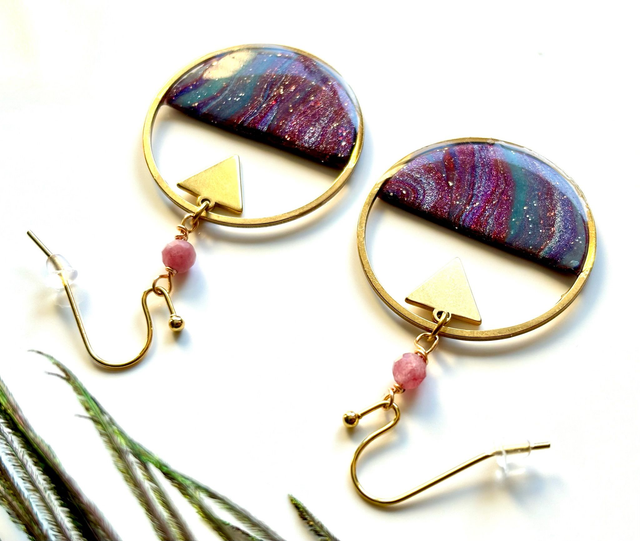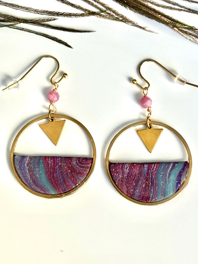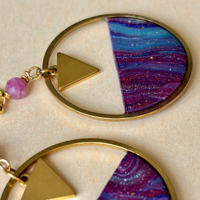 Boucles pendantes dorées au design géométrique et artistique. Chaque pièce est composée d’un cercle doré ajouré, orné dans sa moitié inférieure de polymère marbrée et métallisée aux nuances de violet et bleu. Un triangle doré suspendu ajoute une touche graphique et moderne. Le tout est relié à une perle de tourmaline rose pour un port léger et raffiné.